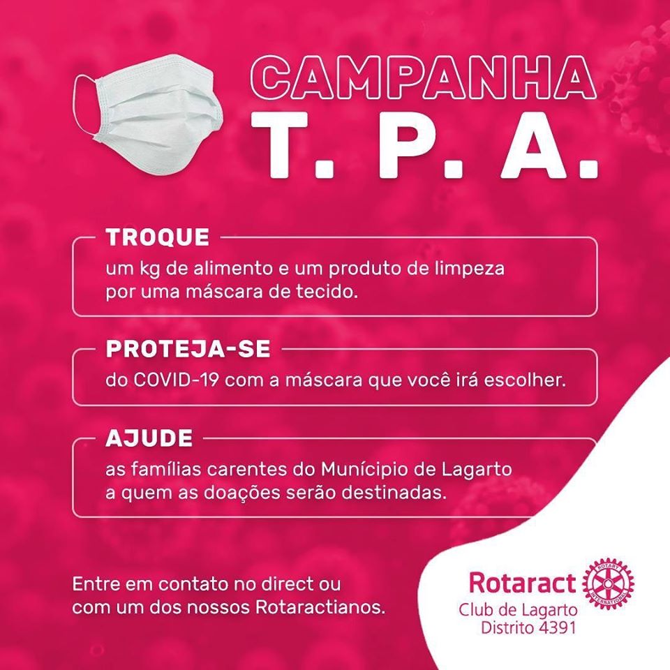 Na Campanha T.P.A., os interessados receberão uma máscara de tecido reutilizável ao doar somente um quilo de alimento e um produto limpeza. Para tal, os interessados em participar devem contatar os rotarianos através do instagram @rotaract_lagarto.