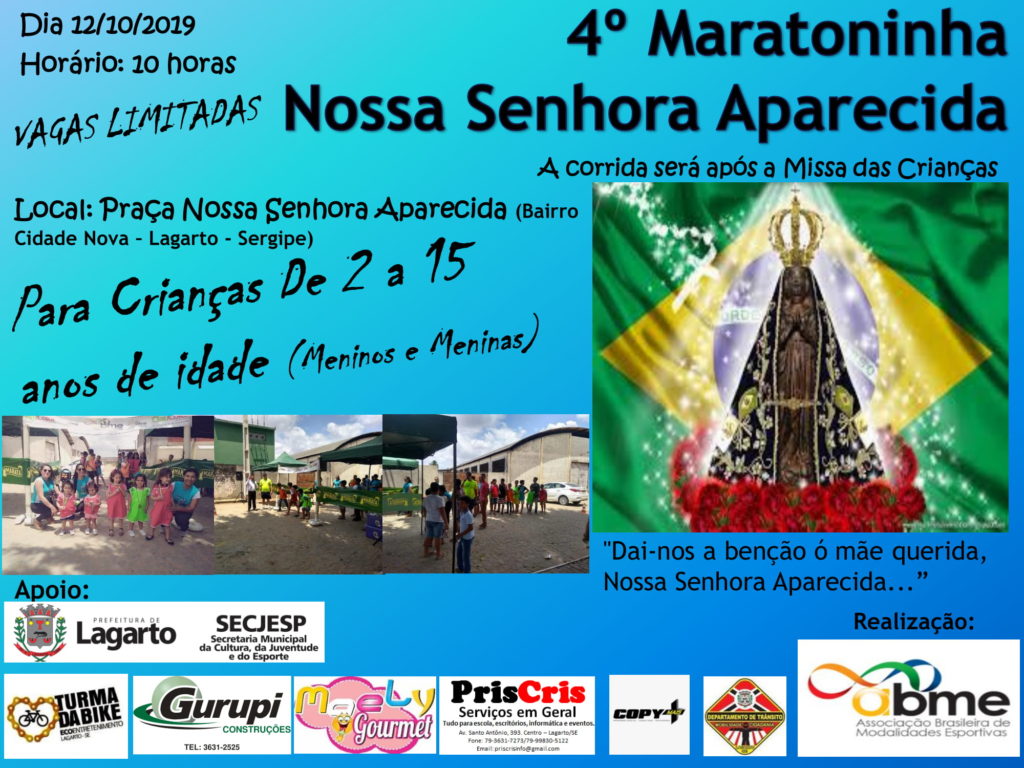 Neste próximo sábado (12), feriado nacional de Dia das Crianças e de Nossa Senhora Aparecida, excelsa padroeira do Brasil, acontece em Lagarto a 4ª Maratoninha Nossa Senhora Aparecida.
