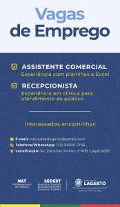 A Prefeitura de Lagarto, por meio da Secretaria Municipal do Desenvolvimento Social e do Trabalho (SEDEST), está oferecendo novas vagas de emprego através do Núcleo de Apoio ao Trabalho (NAT) para Lagarto.