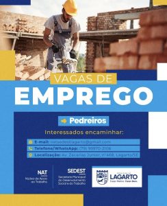 Apoio ao Trabalho (NAT), anunciou que está com vagas de emprego disponível para Pedreiro.