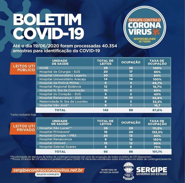 Segundo o boletim epidemiológico divulgado nesta sexta-feira, 19, pela Secretaria de Estado da Saúde (SES), Sergipe registrou 471 novos casos do novo coronavírus e mais 26 óbitos.