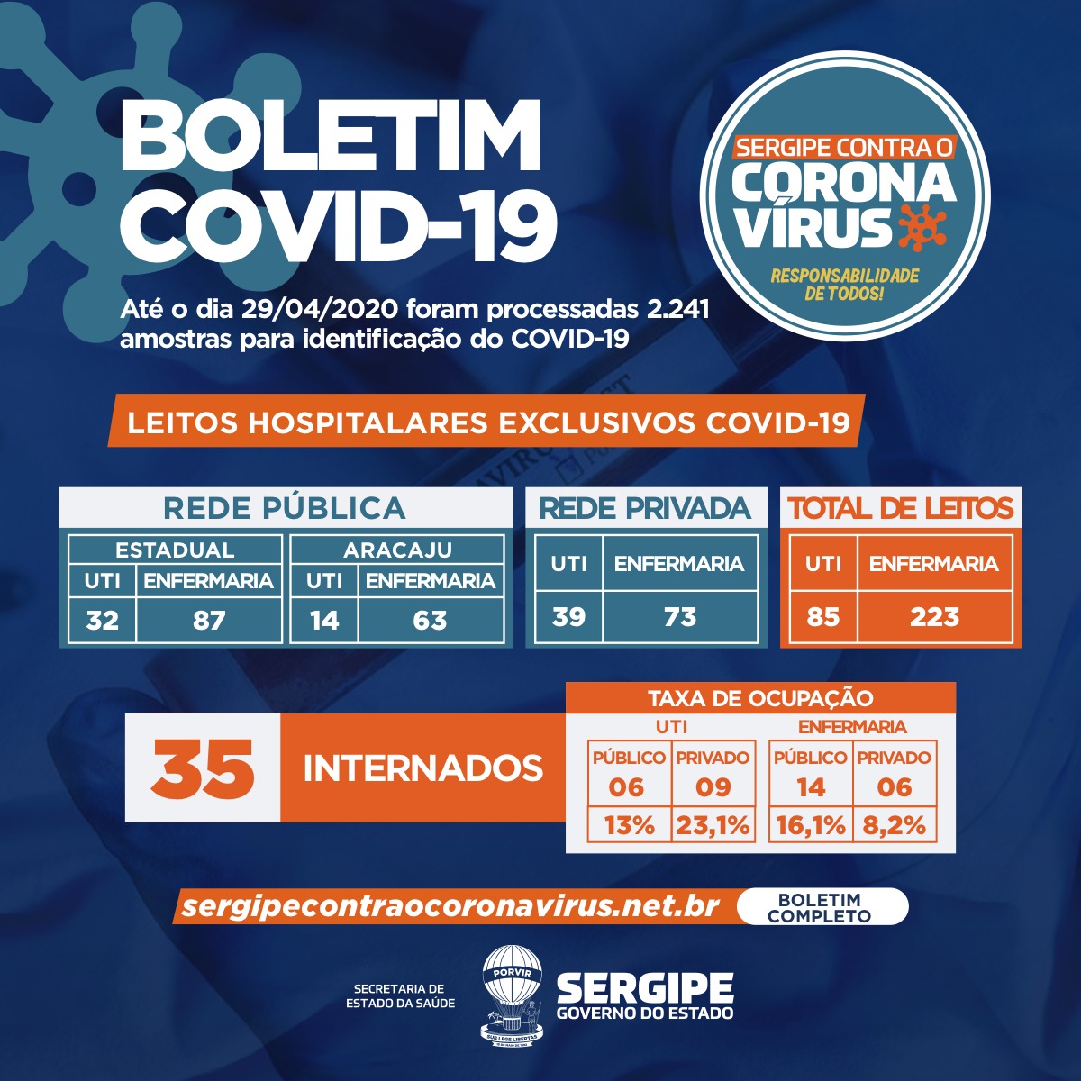 Ao todo, foram realizados 2.241 testes e 1.904 foram negativados. Estão internados 35 pacientes, sendo 15 em leitos de UTI (nove na rede privada e seis na rede pública) e 20 em leitos clínicos (seis na rede privada e 14 na rede pública). Até o momento, 45 pessoas já receberam alta e o estado possui 12 óbitos registrados.