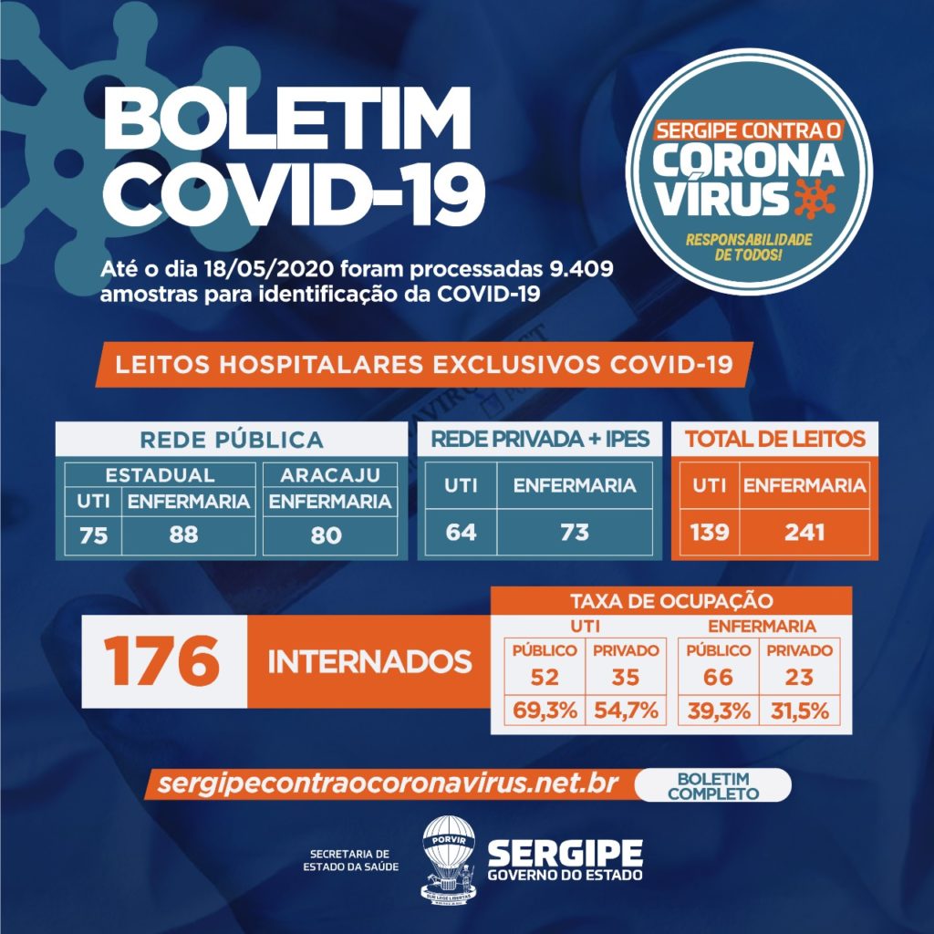 Até o momento, são 1.213 pessoas curadas no estado e 2.118 estão em isolamento domiciliar. Segundo a SES, foram realizados 9.409 exames em Sergipe e 5.843 foram negativados. Estão internados 176 pacientes, sendo 87 em leitos de UTI (35 na rede privada e 52 na rede pública) e 89 em leitos clínicos (23 na rede privada e 66 na rede pública).