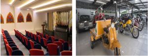 Crematório e área decorada com carros antigos. Fonte: https://memorialsantos.com.br/tributum/. Google.com.br (imagens), 2023.