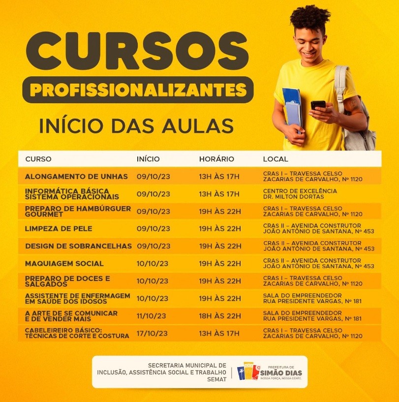 A Prefeitura de Simão Dias, por meio da Secretaria de Inclusão, Assistência Social e Trabalho, informa o cronograma para início e horário dos cursos profissionalizantes a ser ofertado pela gestão municipal através de convênio com o Centro de Educação Profissional (CEP) do SENAC/Lagarto.