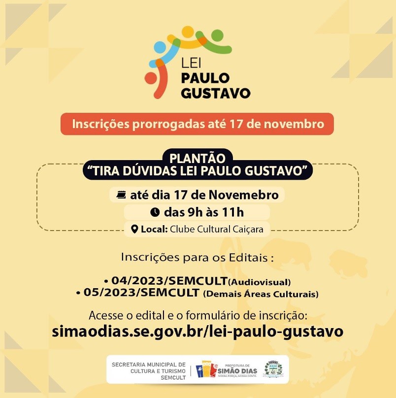 A Prefeitura de Simão Dias, por meio da Secretaria de Turismo e Cultura, prorrogou até a próxima sexta-feira, 17, as inscrições para os editais da Lei Paulo Gustavo.