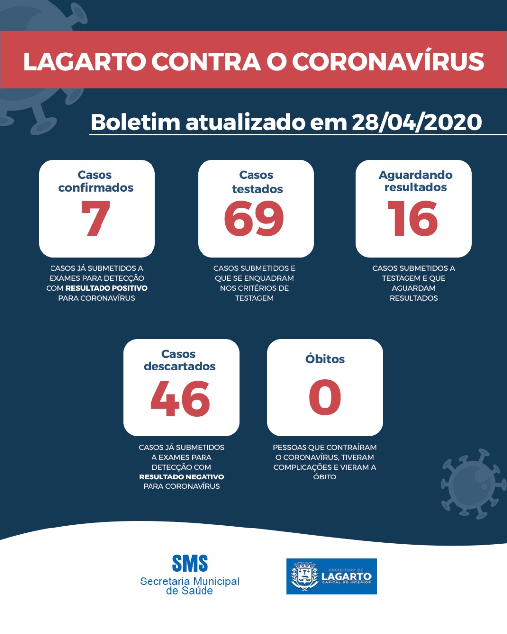 A pasta ainda informou que, em Lagarto, 69 casos foram submetidos a testagem, dos quais 46 negativaram para o Coronavírus, e 16 aguardam resultados de exames. Com isso, subiu para 02 para 07 o quantitativo de infectados no município.