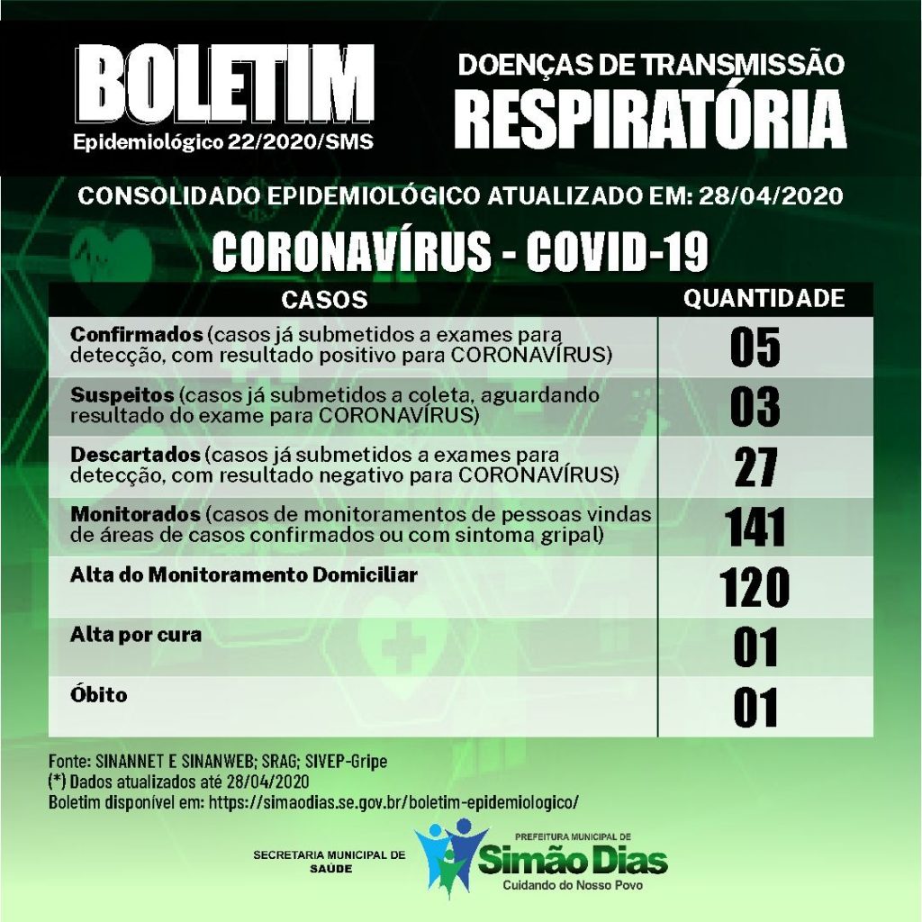 Já em Simão Dias, a Secretaria Municipal de Saúde confirmou o quinto caso de Covid-19. Trata-se de uma mulher de 57 anos que está clinicamente bem e em isolamento domiciliar.
