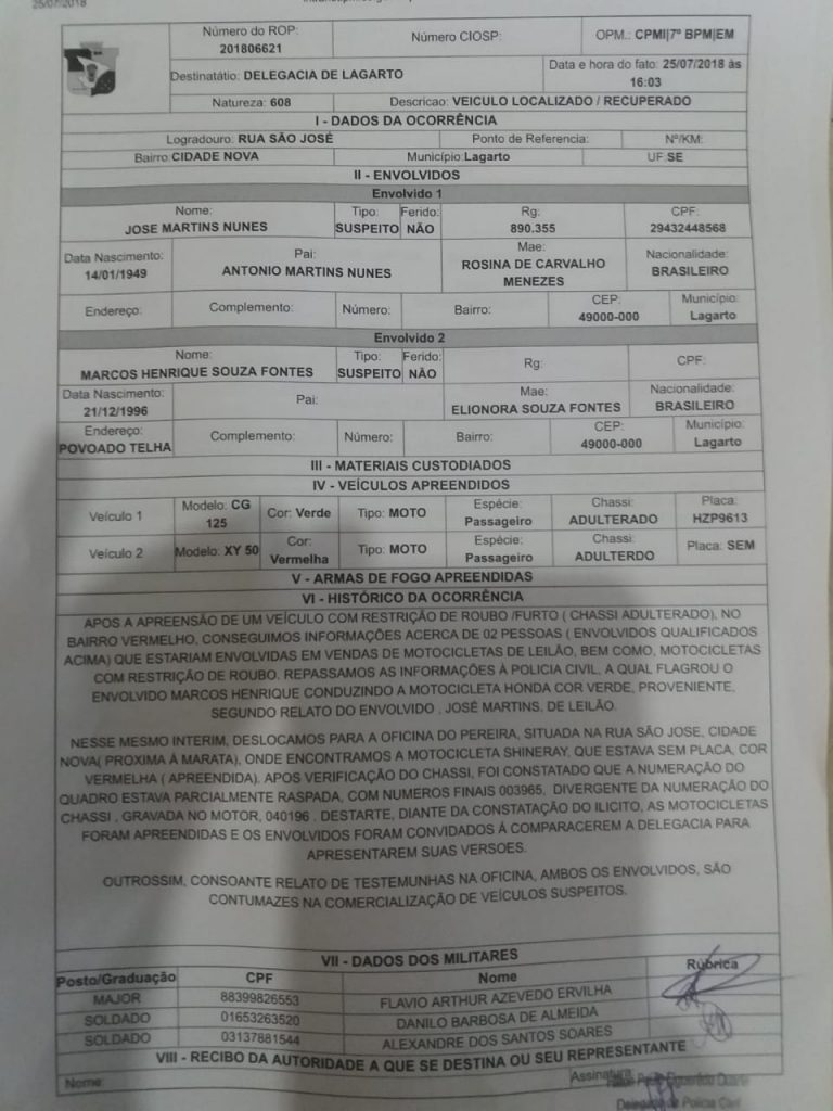 Outrossim, ele também foi preso pela Polícia Militar, no mês de junho do corrente.Na tarde desta, quarta-feira, Policiais Militares do 7 Batalhão, durante diligências, relacionadas à uma investigação de venda irregular de motocicletas, provenientes de leilão e com restrições de roubo/furto, lograram êxito em encontrar em uma oficina no bairro Cidade nova, mais duas motocicletas provenientes de ilícito. Os supostos envolvidos, foram encaminhados à delegacia de Lagarto para as providências legais.